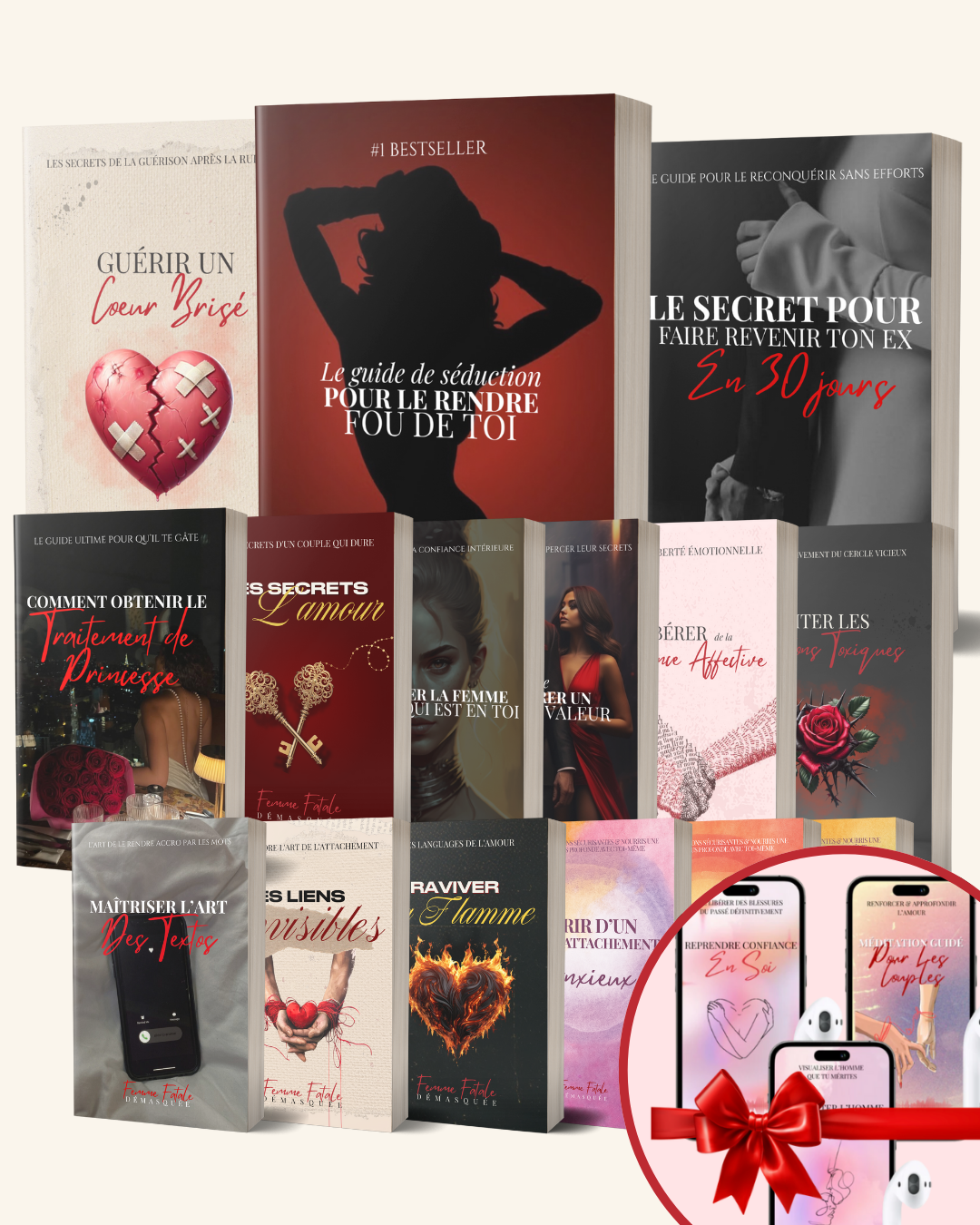 Tu reçois les piliers de la Femme Fatale tout en passant par la guérison. Il regroupe tous les indispensables pour t'accompagner, de la rupture à la séduction, jusqu'à commencer une nouvelle relation. De plus, c'est la meilleure offre possible, car tu économises près de 250 € par rapport à l'achat de chaque guide individuellement. C'est un véritable investissement en toi, pour un avenir plein d'espoir et de changement durable.